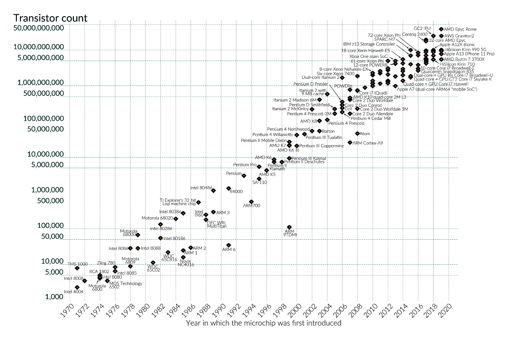 Le graphique ci-dessous montre, en abscisses, les années 1970 à 2020, et en ordonnées, le nombre de transistors intégrés dans un microprocesseur sur une échelle logarithmique (d'une graduation à l'autre, ce nombre est multiplié par deux). L'assertion de Moore a donc tenu bon durant ces cinq dernières décennies.