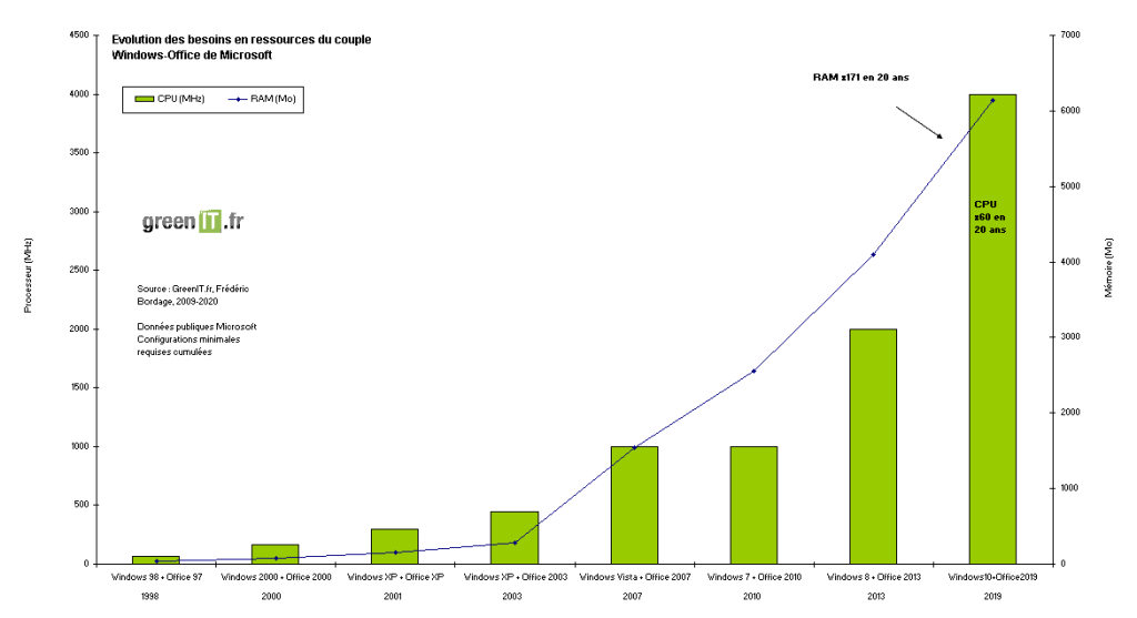 Ce graphique montre qu'en 20 ans, les prérequis ont été multipliés par 60 pour le CPU, et par 171 pour la RAM 😱 Pourtant, les évolutions fonctionnelles sont très loin de justifier une telle explosion, surtout au regard des usages les plus courants. Pour aller plus loin, voici le texte originel du Plaidoyer pour le logiciel frugal, publié en 1995 par Niklaus Wirth (site de l'École polytechnique fédérale de Zurich).