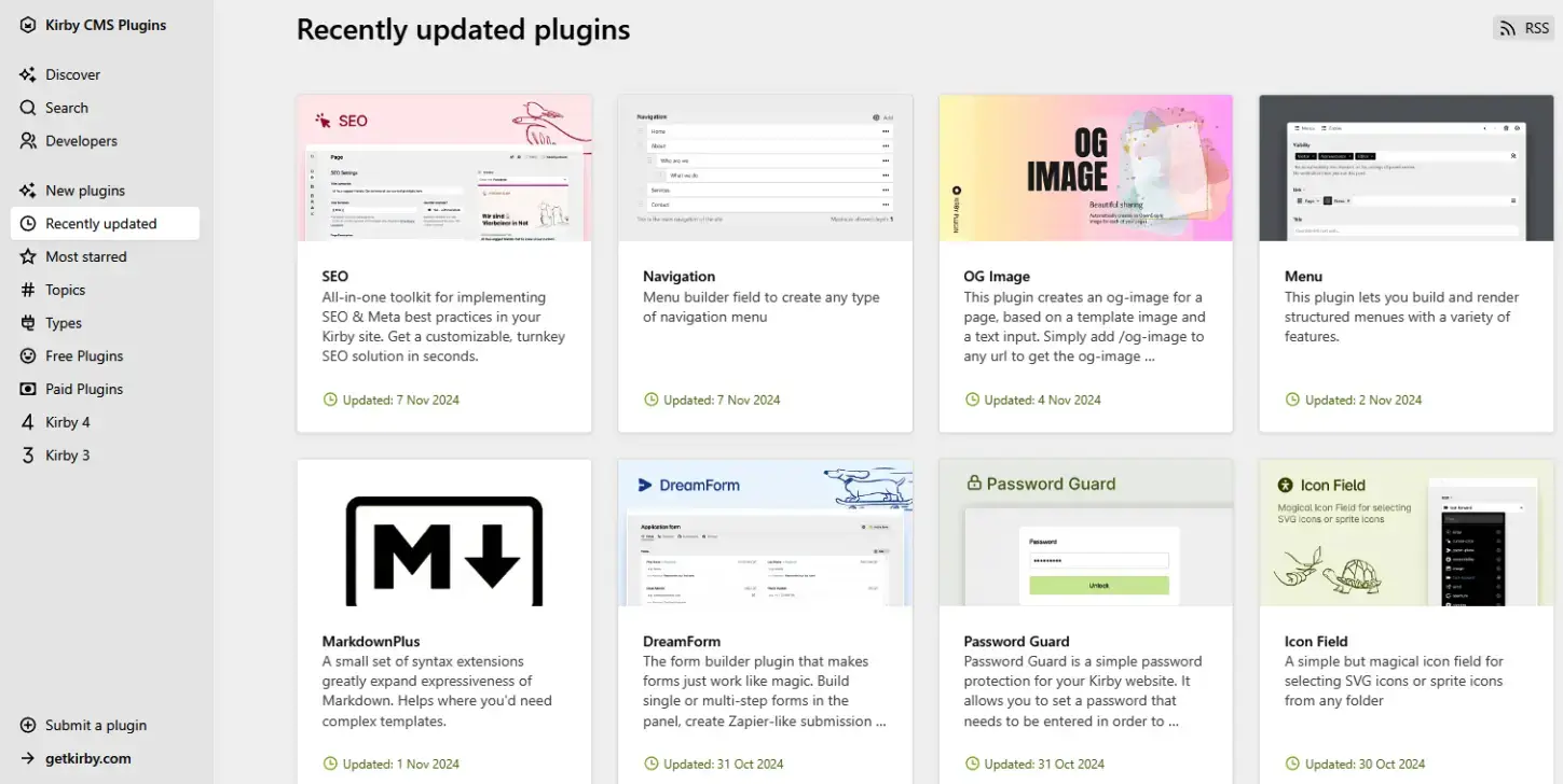 Le répertoire d'extensions de Kirby n'est pas très fourni, mais j'ai été agréablement surpris par la diversité et la pertinence du catalogue. Toutes les extensions sont directement reliées à des dépôts GitHub, et pour ce que j'en ai vu, elles sont toutes gratuites, avec possibilité de faire un don.