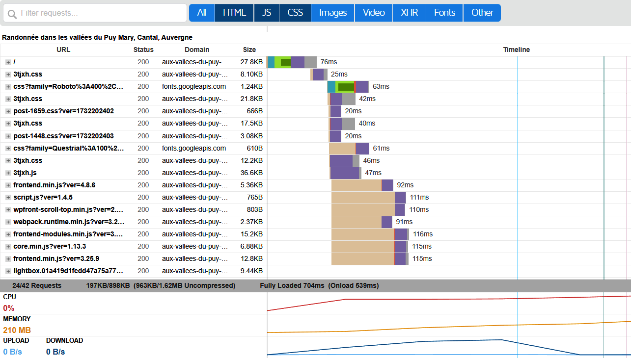 En effet, est-il préférable de charger un seul fichier CSS de 100 ko, plutôt que 5 fichiers CSS de 20 ko ? Cet article de GTMetrix, parmi d'autres, signale qu'avec le protocole HTTP/2, cela n'a rien d'évident. Dans les captures d'écran ci-dessous, on voit que les ressources CSS et JS du site Aux vallées sont chargées en parallèle avec HTTP/2.